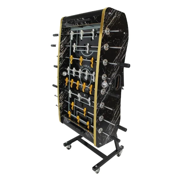 بدنه فوتبال دستی هایگلاس رعد نقرهای PVC طلایی S12 المپیک از جنس هایگلاس مشکی و سفید با طرح رعد نقرهای ساخته شده است. سطح درخشان و صیقلی آن جلوهای لوکس به فضا میبخشد و در برابر خطوخش و ضربه بسیار مقاوم است.